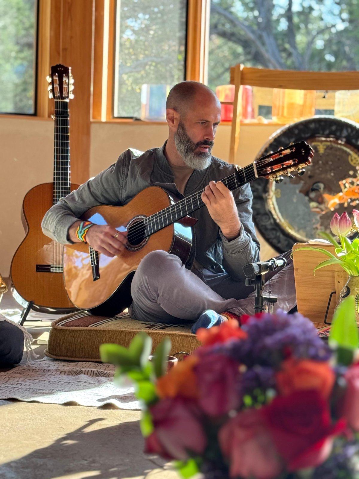 You can expect to hear the sounds of instruments such as the gong, guitar, hand pan, drums, harmonium, crystal bowls and voice.