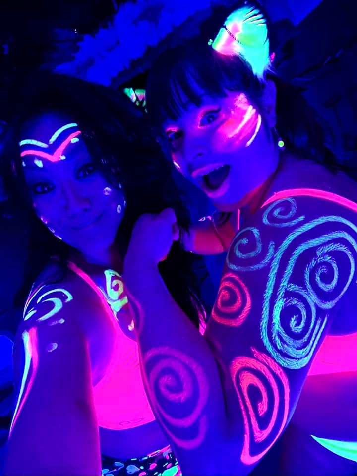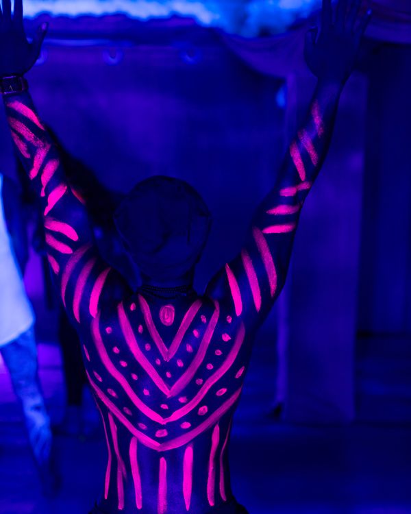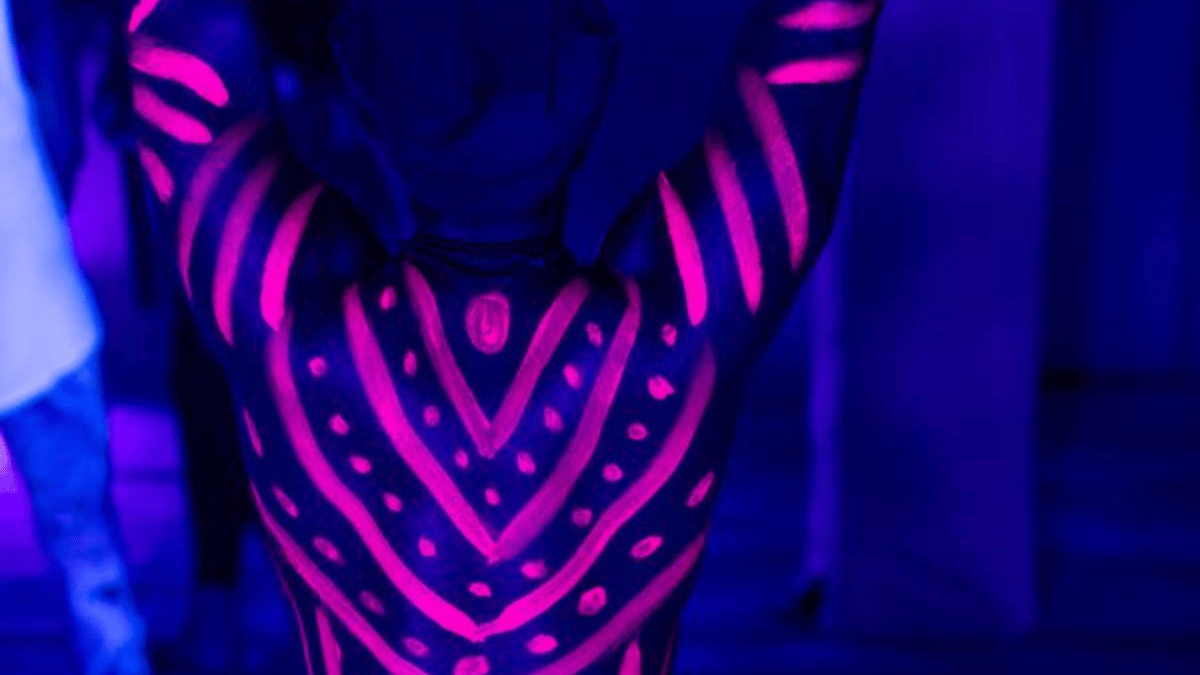 Wear your white or neon clothing, put on some neon paint or wear anything else that will glow.