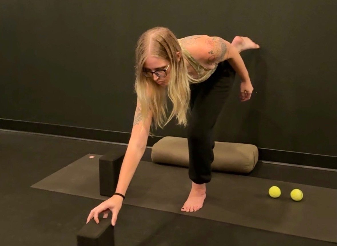 The class combines functional movements, CARs (Controlled Articular Rotations), Kinstretch techniques, and myofascial release with props like straps, blocks, bolsters, and tennis balls to help you access deeper stretches comfortably.